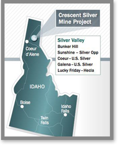 Crescent Silver, LLC is a mining company with operations in Kellogg Idaho. Crescent Silver, LLC owns a 100% interest in the Crescent Silver Mine project in Idaho’s prolific Silver Valley between two of the world’s historically largest silver producing properties, the Sunshine and Bunker Hill mines. Crescent Silver, LLC also offers a full suite of mining services including contract mining and mine machine repair and fabrication services.